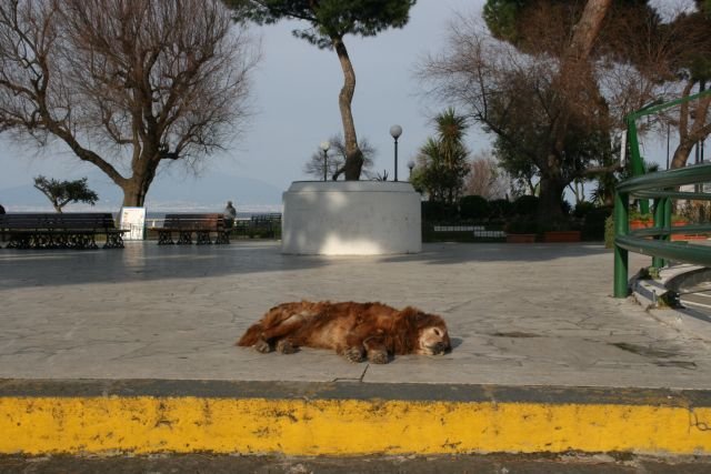 Da haut's doch den stärksten Hund um! Ein streunender Hund sonnt sich in den ersten warmen Sonnenstrahlen an der Hafenpromenade von Sorrento.