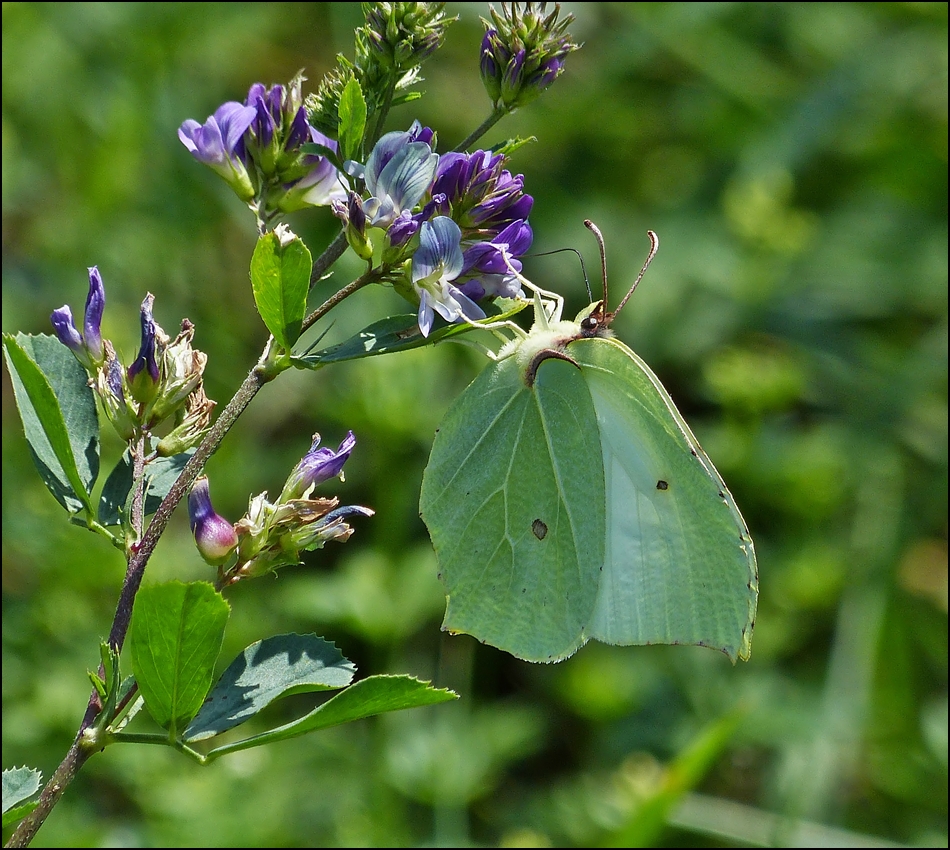 . Frühling 2013 - Der erst Schmetterling in unserem Garten: Ein Zitronenfalterweibchen (Gonepteryx rhamni) beim Nektarnaschen erwischt am 17.04.2013. (Jeanny) De Rond Hans und Jeanny