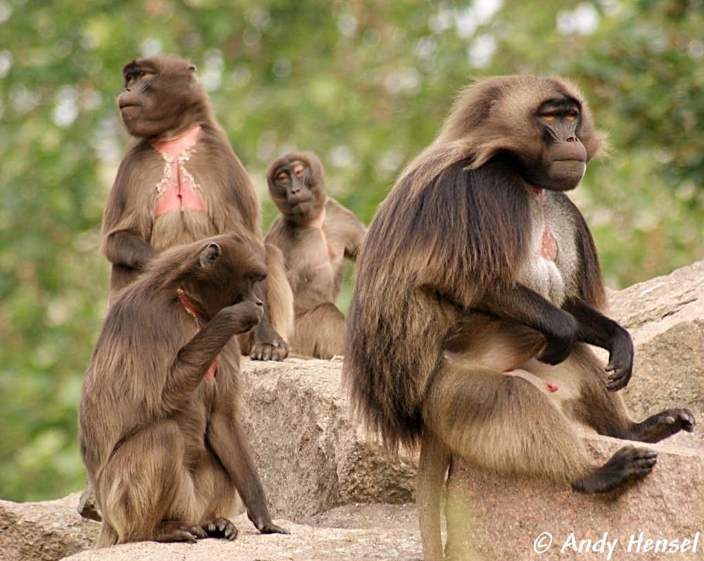 Blutbrustpavian (Dscheladas). Anders als bei den Pavianen führen bei den Dscheladas Weibchen die Gruppe an.