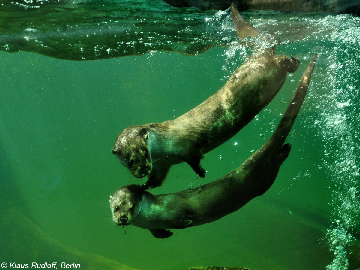 Zwei Nordamerikanische Fischotter (Lutra canadensis) beim Spielen. Zoo Basel am 19.3.2010.