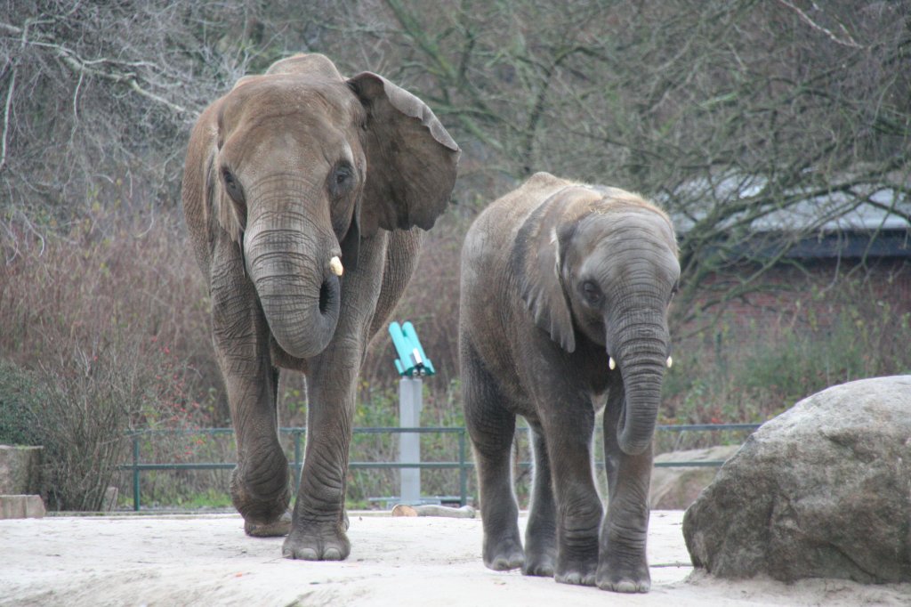 Zwei Afrikanischer Steppenelefanten (Loxodonta africana) auf dem Aussengelände am 13.12.2009 im Tierpark Berlin.