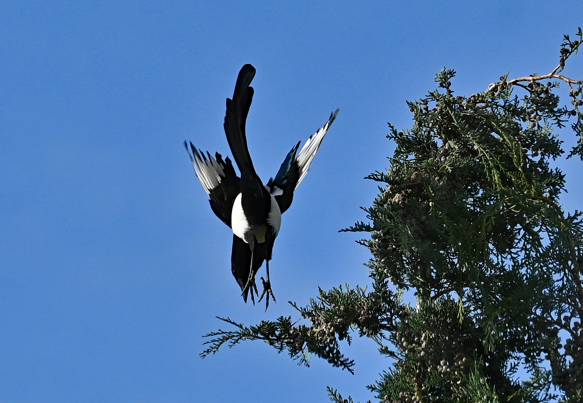 Elster im Sturzflug von der Baumspitze zu einem tiefer gelegenen Ast. 26.10.2021