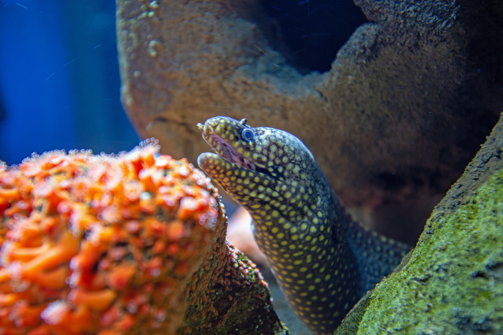 Kopf einer Drachenmuräne(Enchelycore pardalis) am 12.12.2009 im Aquarium des Berliner Zoos. Da möchte man keine nähere Bekanntschaft mit den Zähnchen machen. Gilbert Angermann