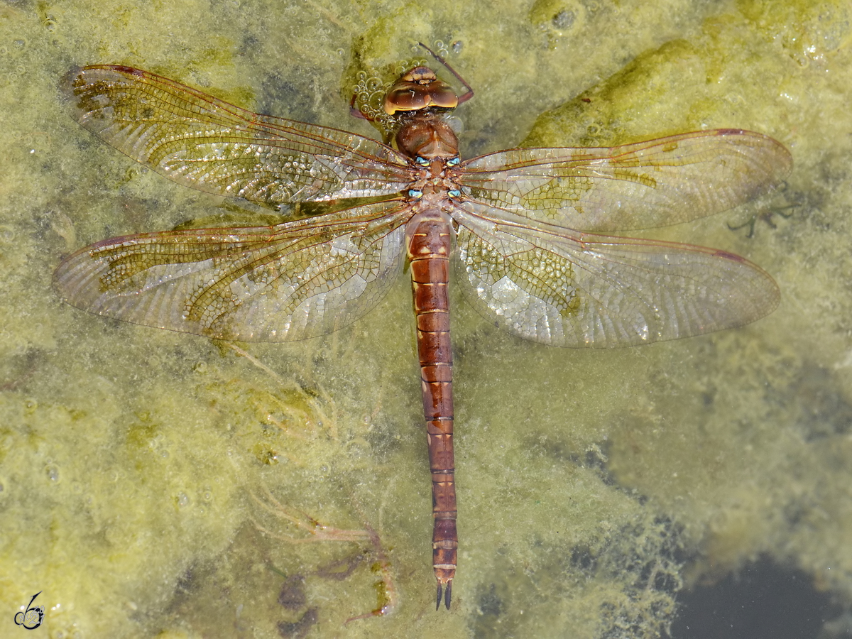 Eine Situation, die ich schon damals nicht einschätzen konnte, ein frisch geschlüpfte oder ins Wasser "gefallene" Mosaikjungfer? (Gützkow, August 2013)