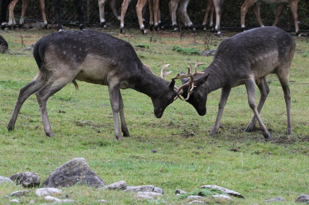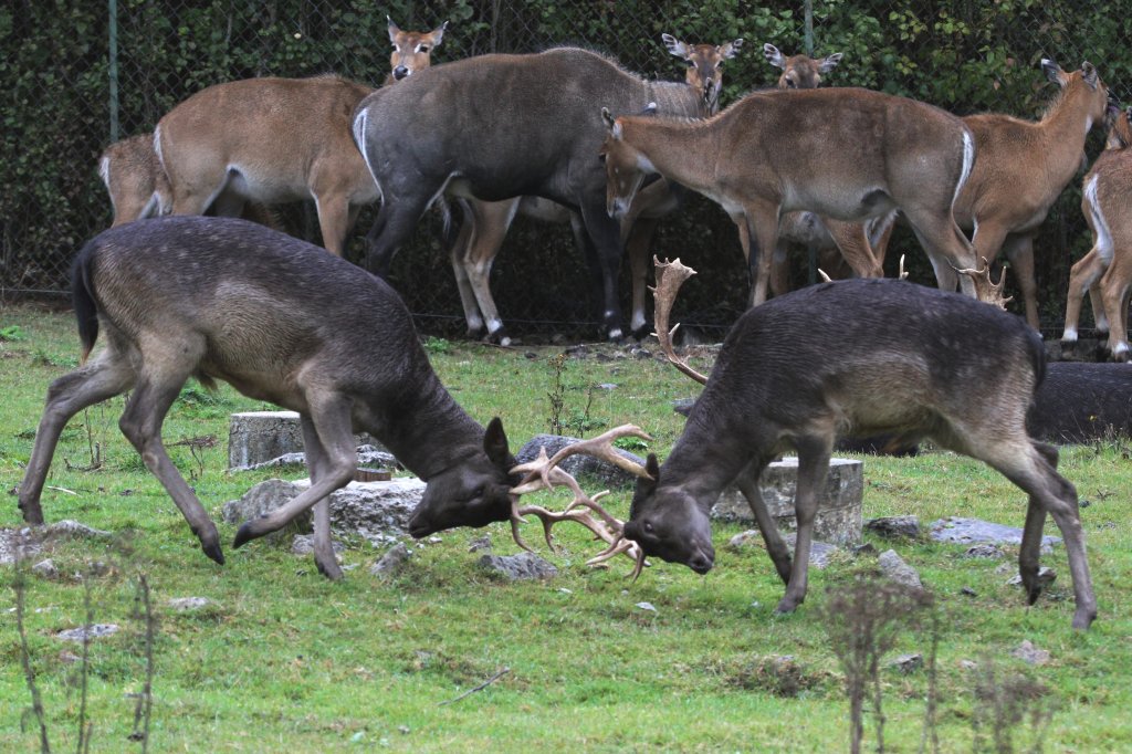 Alles hat Hunger! Bisons, Damhirsche und Wapitis rennen hinter einem Pickup hinterher, von dem aus Futter heruntergeworfen wird. African Lion Safari in Cambridge,Ont am 2.10.2010.