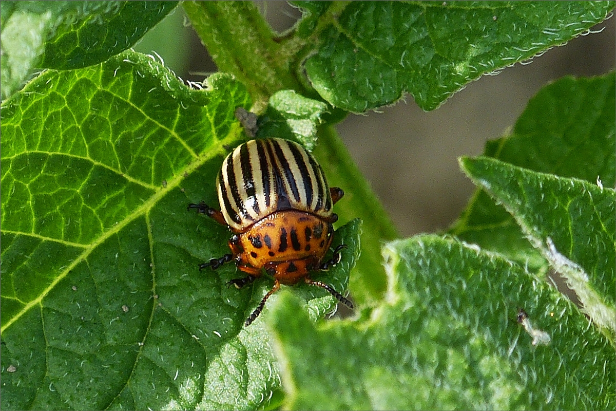 White-striped leaf beetle (Zygogramma suturalis) am 29.10.2010 bei Milton,Ontario. Diese Käfer sind auf Ambrosia-Pflanzen spezialisiert und wurden auch schon versuchsweise zur Bekämpfung eingesetzt.